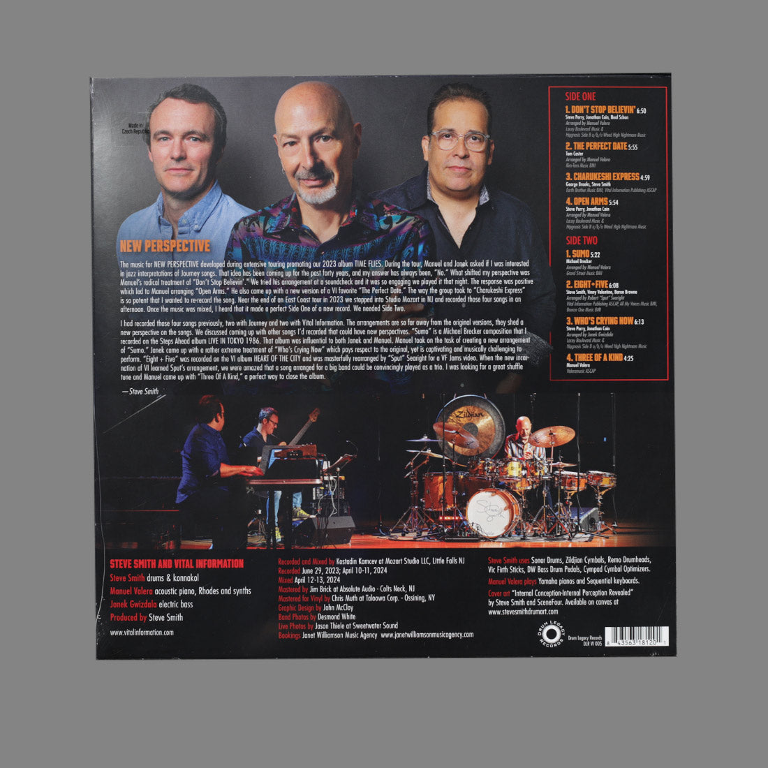 The music for Vital Information’s NEW PERSPECTIVE developed while touring the USA promoting their 40th Anniversary album TIME FLIES. The band’s keyboardist, Manuel Valera and bassist Janek Gwizdala asked Steve Smith if he was interested in playing any jazz interpretations of the “Journey” songs that he had created during his tenure with the supergroup in the 1970’s,80’s and 90,s. That question has been coming up for the past 40 years and Smith’s answer has always been “No.” Ignoring Steve’s concerns, Manuel decided to come up with a radical treatment of “Don’t Stop Believin.’” The band tried it at a soundcheck, played it that night and it got a positive response, which shifted the Journey veteran’s perspective. On June 29, 2023, near the end of an east coast tour, the band stopped at Studio Mozart in Little Falls, NJ to record “Don’t Stop Believin,’” “Open Arms,” plus new versions of Vital Information classics “The Perfect Date” and “Charukeshi Express.” A theme for the new album was born: Record songs that Smith had previously played on during my career but with new arrangements that are quite different from the original versions, bringing a NEW PERSPECTIVE to the music. The 40th anniversary project New Perspective is available in Compact Disc and High-weight vinyl now.